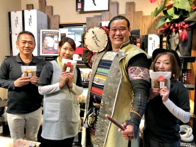 ケーブルテレビMICS 『食遊彩々』に出演! WEBサイトはこちら 〉 グレート家康公「葵」武将隊の酒井忠次さんが来店し、新発売の「とろ~り蜜たっぷり焼きいも」を紹介!